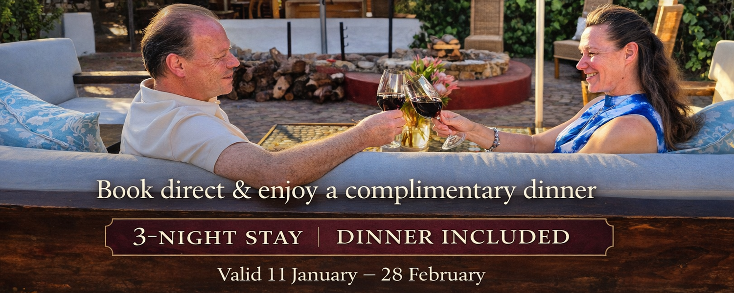 Book a 3-night stay directly with us and enjoy a complimentary dinner for two at our in-house restaurant, the perfect evening to complete your Winelands escape.